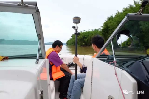 5月24日,在浔江梧州段,市测绘地理信息院工作人员对梧州龙舟队挑战吉尼斯世界纪录的水道进行长度测量及现场定位。