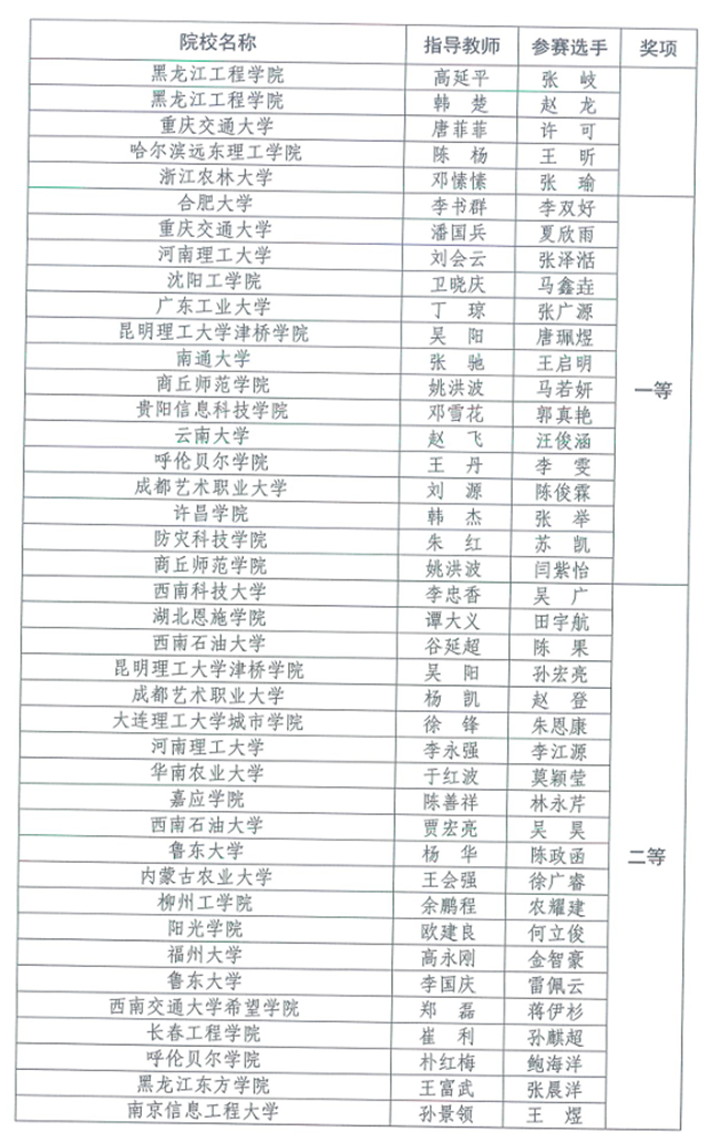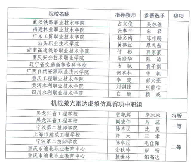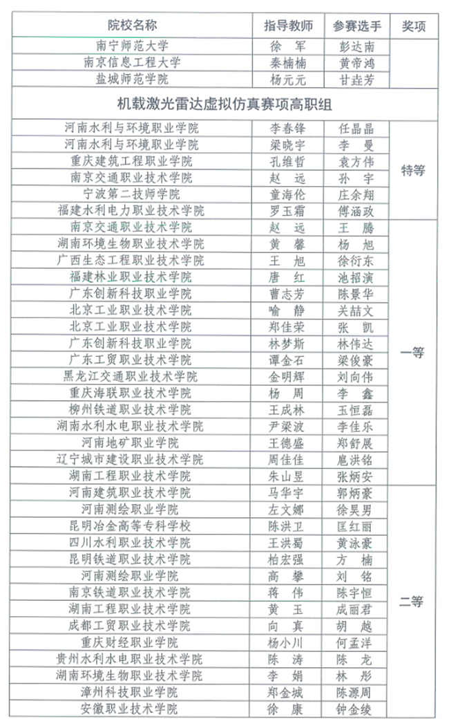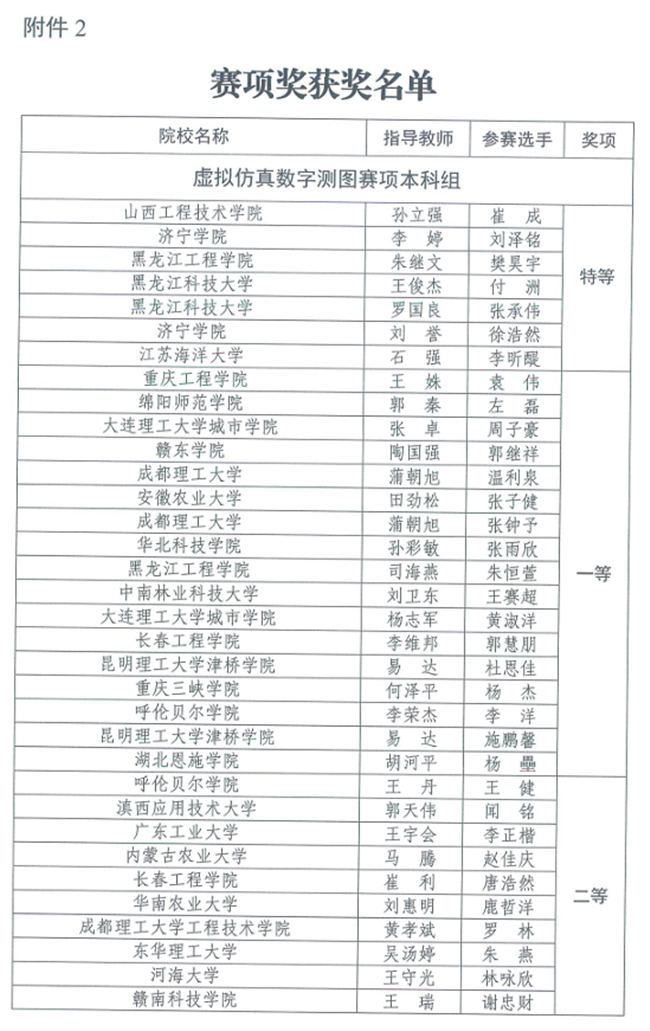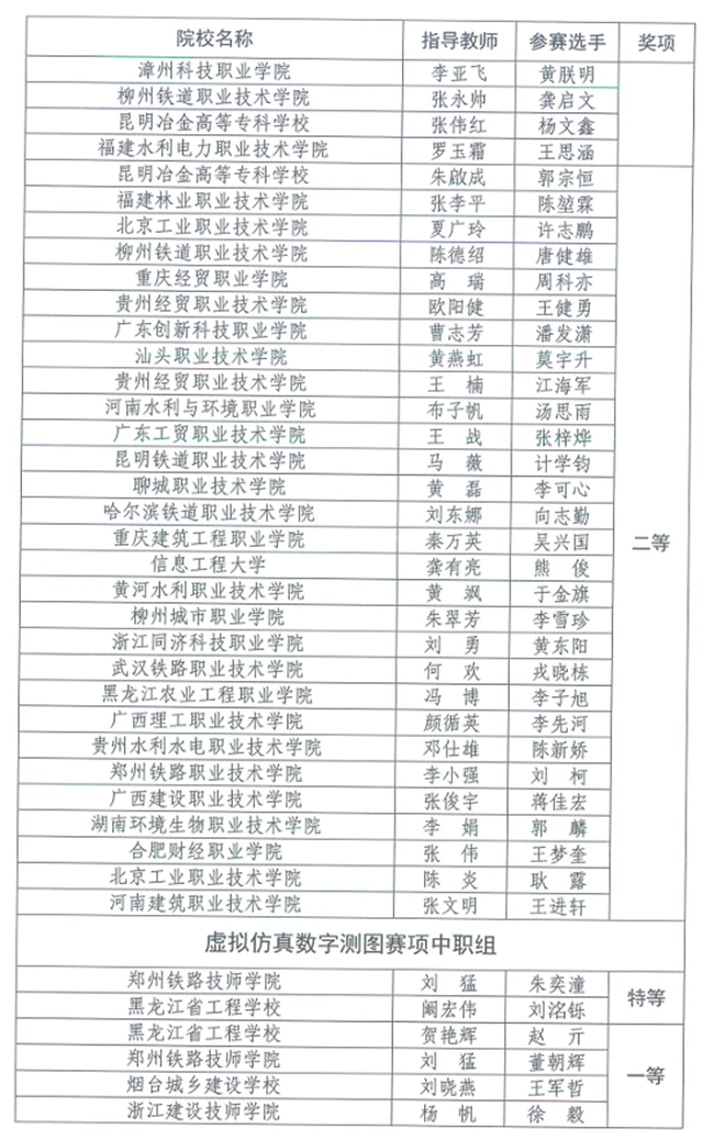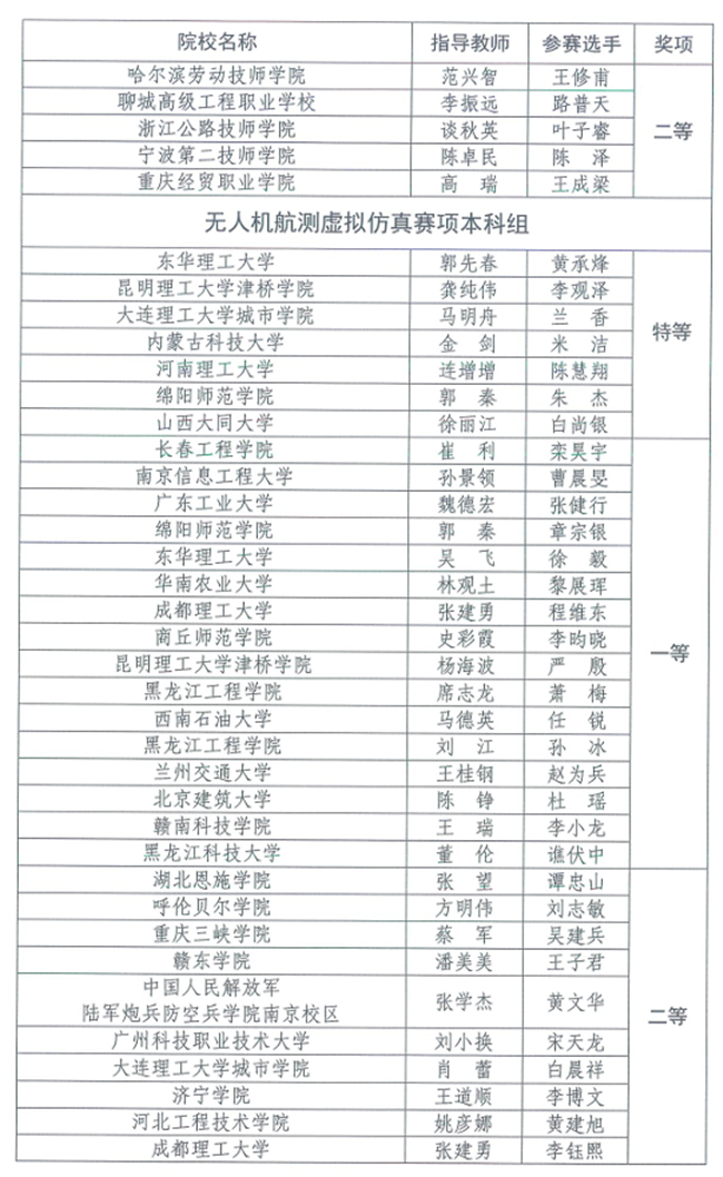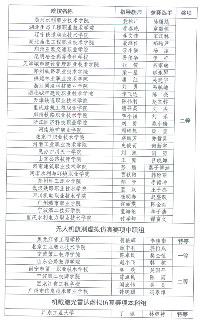 竞赛设本科、高职专科、中职3个类别,每个类别设虚拟仿真数字测图、无人机航测虚拟仿真、机载激光雷达虚拟仿真3个赛项,奖项分为优秀团体奖、赛项奖和优秀指导教师奖。(完整获奖名单附后)