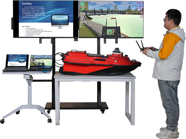真实无人船遥控设备与仿真软件内虚拟无人船的实时同步联动。学生使用实体遥控设备操控虚拟无人船,精准实现手动航行与航线规划航行操作,虚拟无人船的运动状态与真实遥控操作实时对应。在此过程中,可对仿真场景内水下地形及水深进行精准数据采集,采集数据实时传输并保存至硬件设备,采集结束后通过配套软件高效开展内业处理,使实训过程高度逼近真实作业场景。