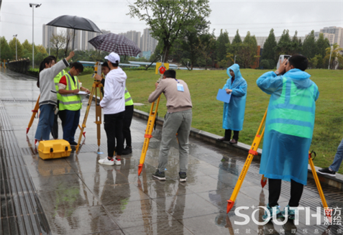 竞赛期间,参赛选手顶风冒雨,默契合作、争分夺秒、精益求精,充分展现了测绘人“经纬水准,描绘祖国山河;铁鞋踏破,丈量祖国大地”的风采与气魄。