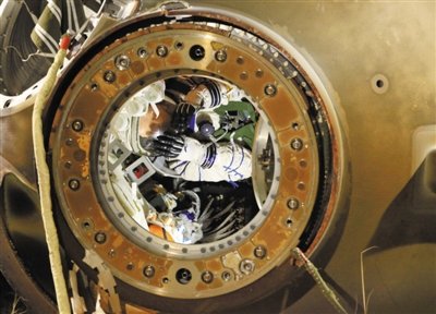 昨晚,神八飞船返回舱在内蒙古四子王旗着陆。这是现场工作人员打开飞船舱门。