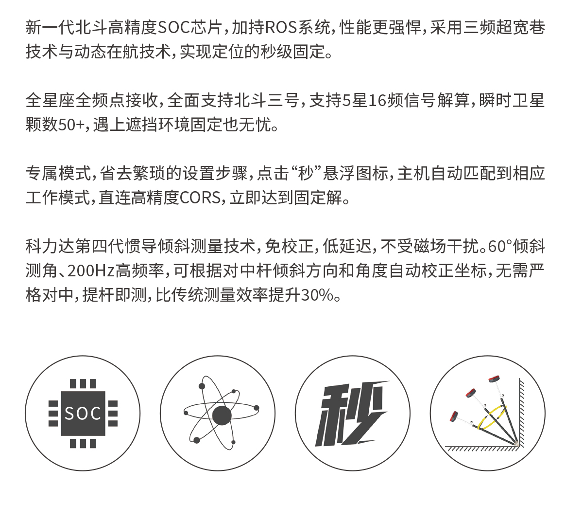 惯导倾斜测量 | 内置IMU惯性测量传感器,支持惯导倾斜测量功能,根据对中杆倾斜方向和角度自动校正坐标。 |