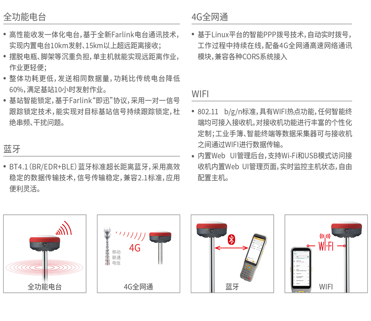 4G全网通 | 基于Linux平台的智能PPP拨号技术,自动实时拨号,工作过程中持续在线,配备4G全网通高速网络通讯模块,兼容各种CORS系统接入 |