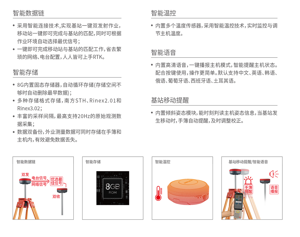 数据存储 | 8G内置固态存储器,自动循环存储(存储空间不够时自动删除最早数据); 丰富的采样间隔,最高支持20Hz的原始观测数据采集 |