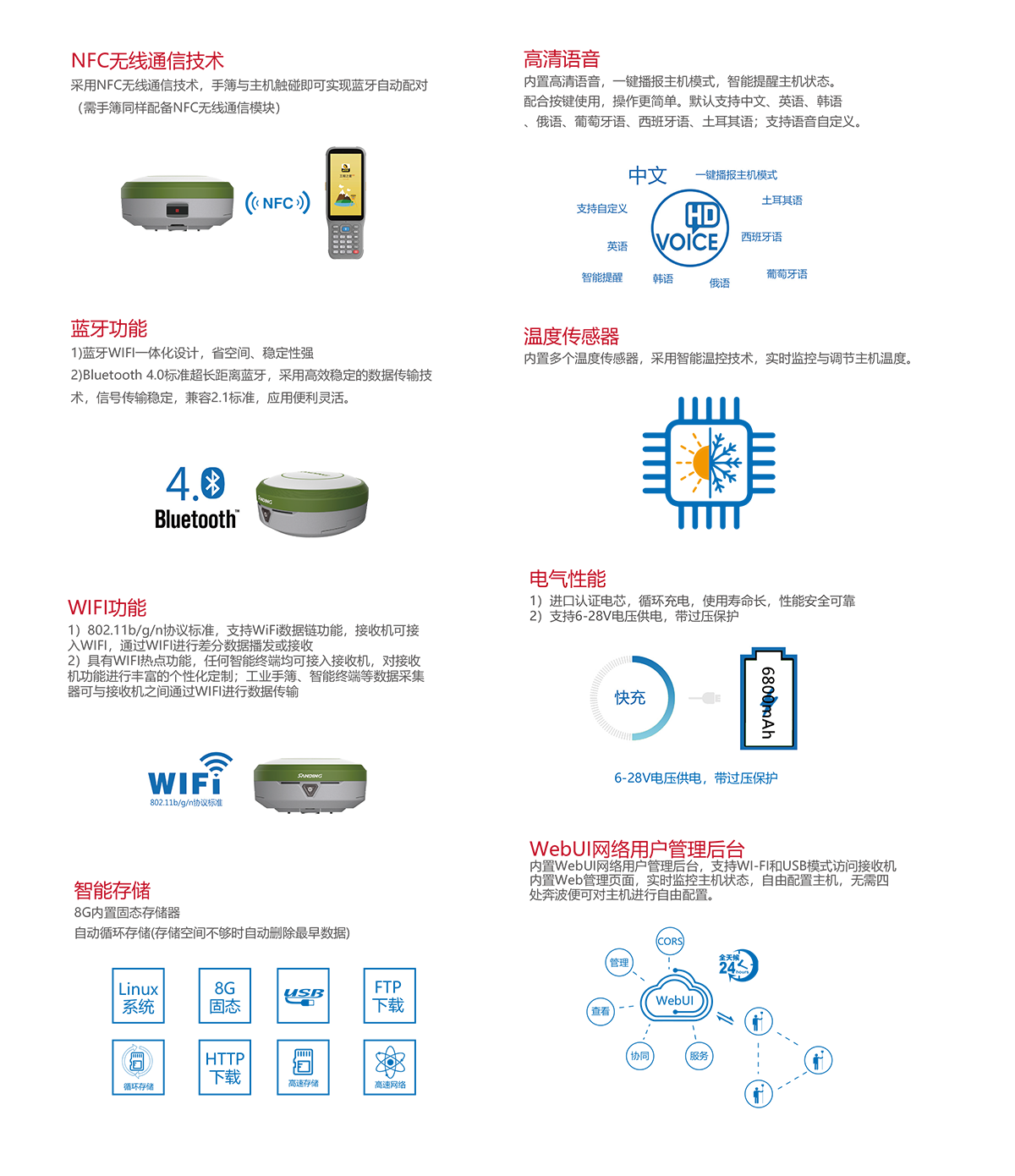 web交互 | 内置Web UI管理后台,支持Wi-Fi和USB模式访问接收机内置Web UI管理页面,实时监控主机状态,自由配置主机。 |