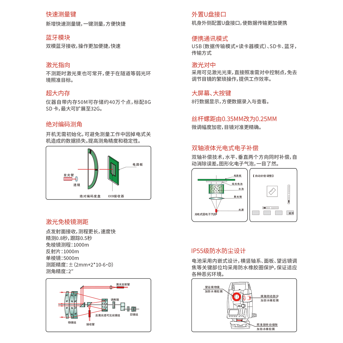 精度 | 0~500m:±(3+2×10-6·D)mm 500~1000m:±(5+2×10-6·D)mm 1000~1500:±(10+2×10-6·D)mm |